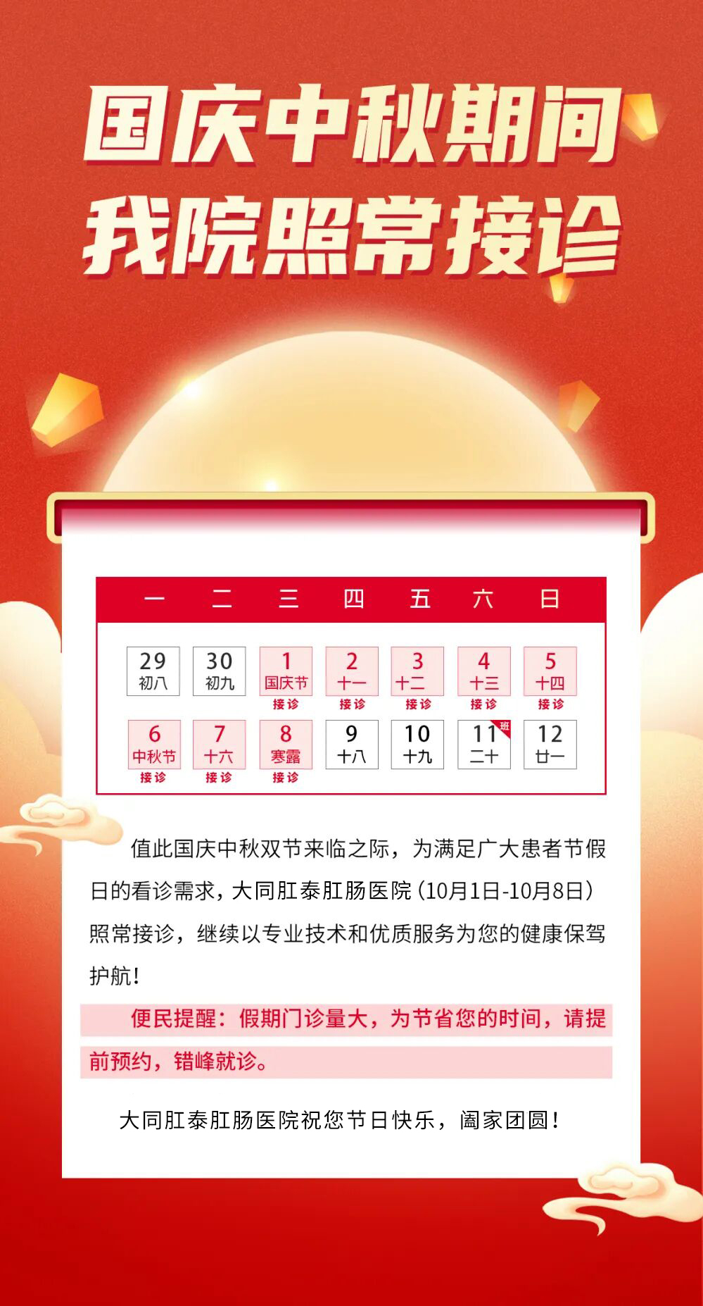2025年国庆中秋假期(10月1日-10月8日)照常接诊,确保患者在节假日也能享方便、快捷、优质的医疗服务。
